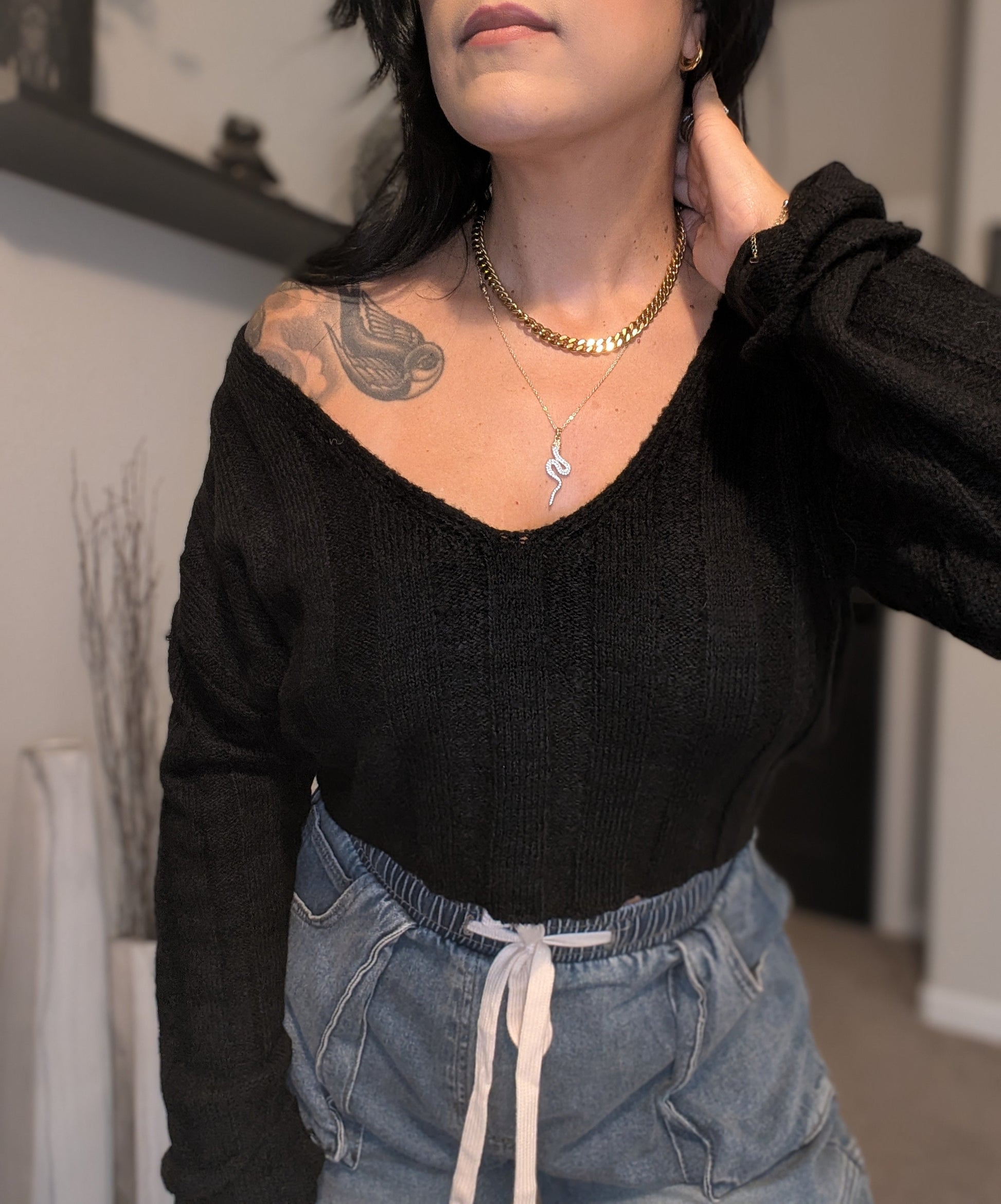 Designed with thick vertical ribbing, soft v-neck, long sleeves and drop shoulders. The cropped bodice has a close fit that gives a flattering look.